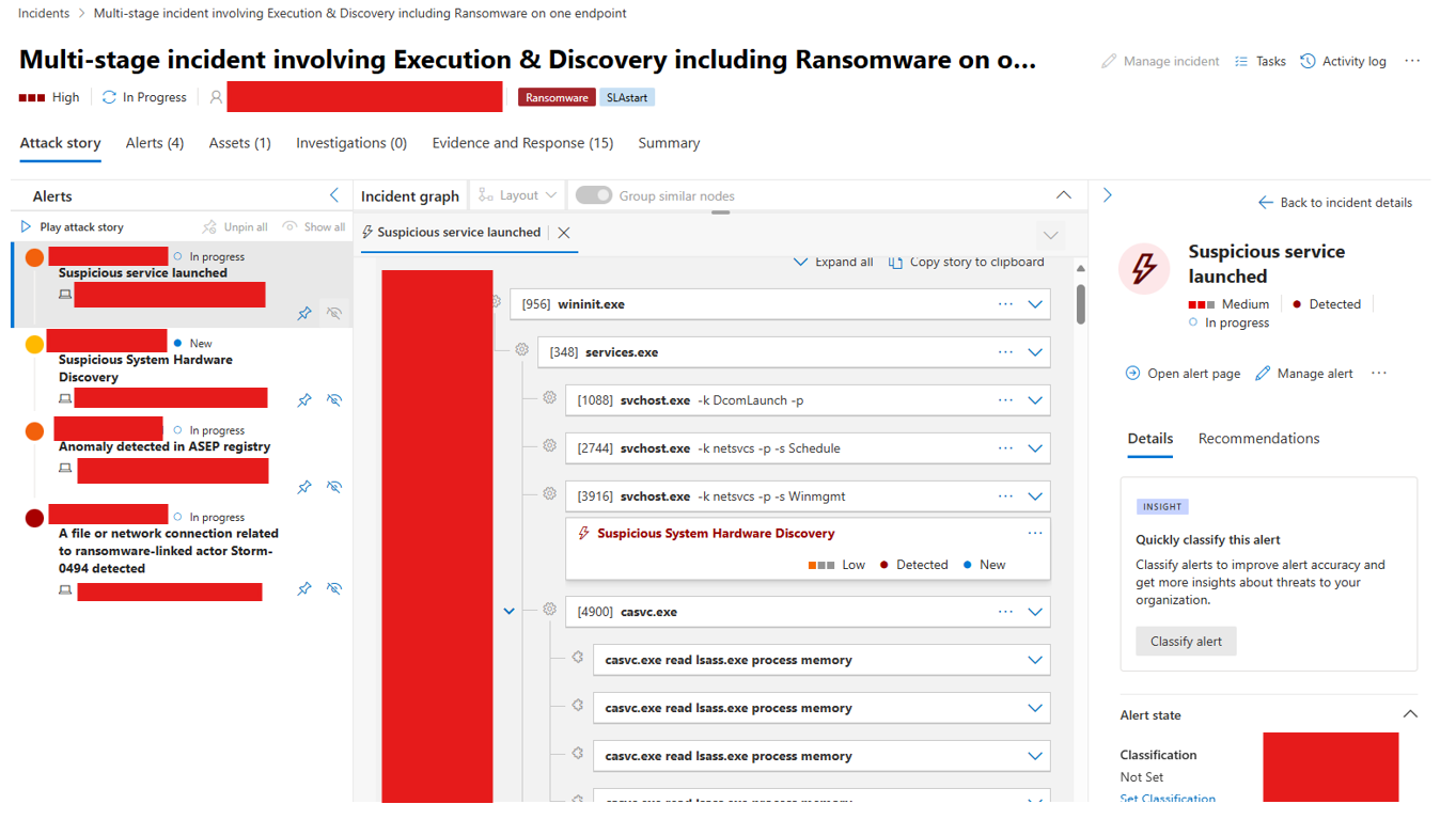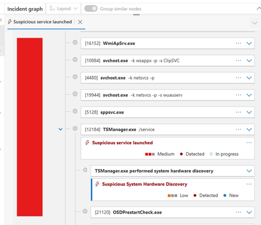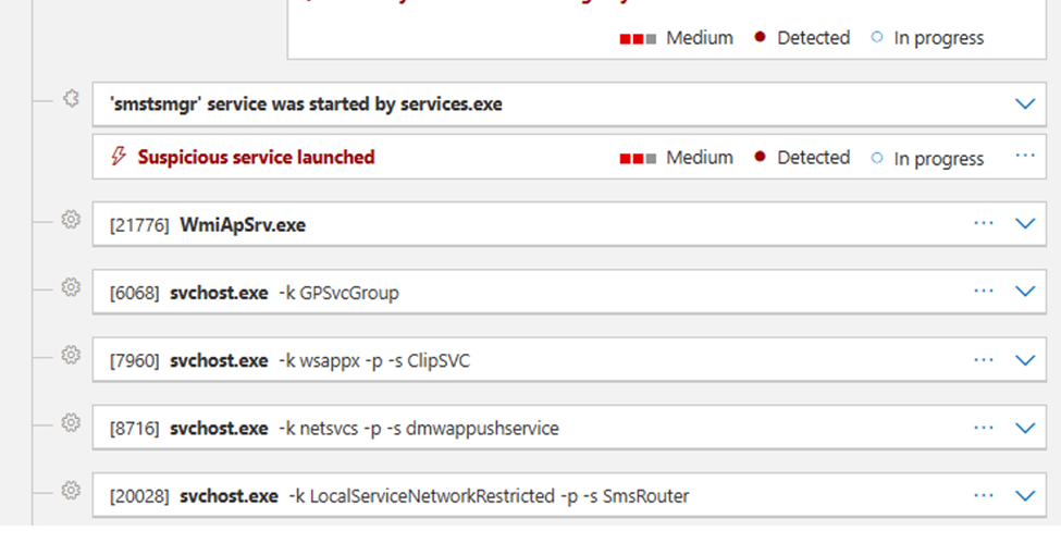 The first alert, “Suspicious service launched,” immediately caught my attention. Those always make me uneasy because they can indicate long-term persistence finally executing after a period of silence. If that were true, it could’ve been sitting quietly across multiple endpoints. (Interestingly, another device triggered a different multi-stage in the same hour with the same first three components, but the last one was labeled “info-stealer.” Side note: weird to have an info-stealer as a service, right?)