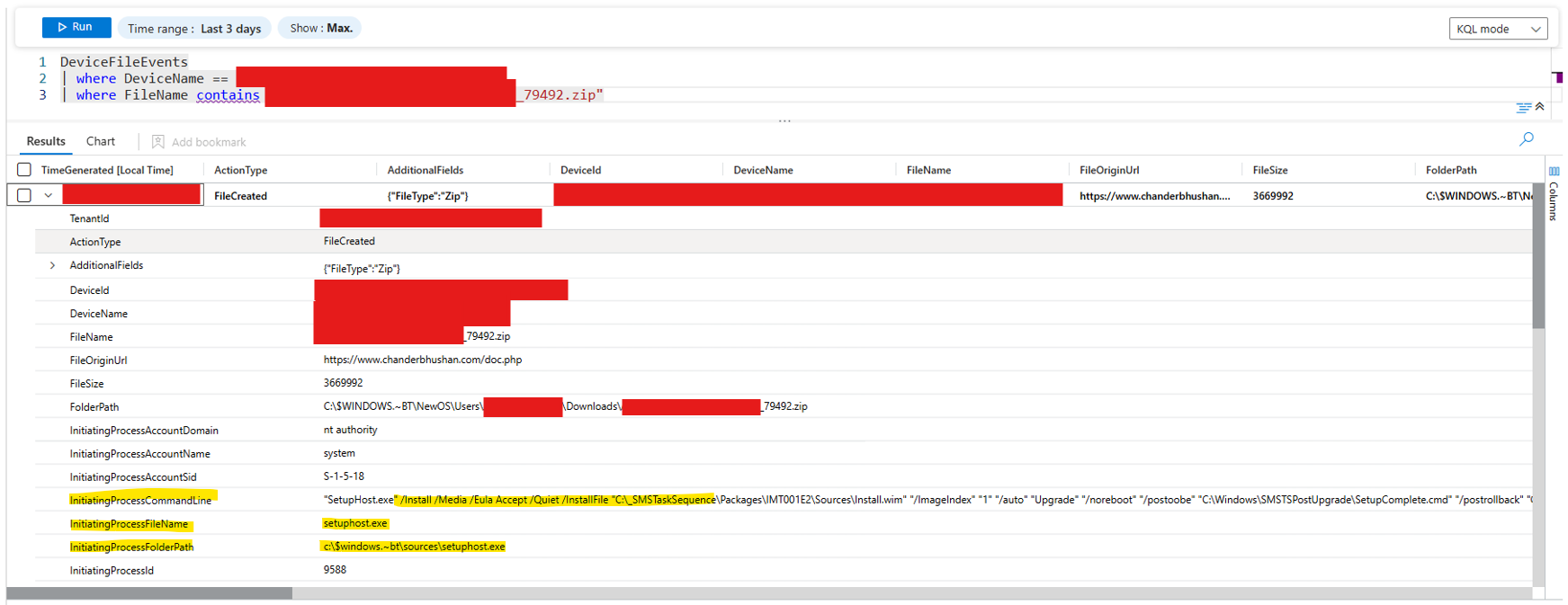 The client had deployed MDE but skipped the post-onboarding full scan. The malicious ZIP had been sitting there long before Defender ever showed up. Since no process interacted with it, MDE didn’t know it existed until setupHost.exe copied it, and that single action checked all the boxes for ransomware behavior: High count of file modifications + MOTW correlation + known CTI of Gootloader abused domain.